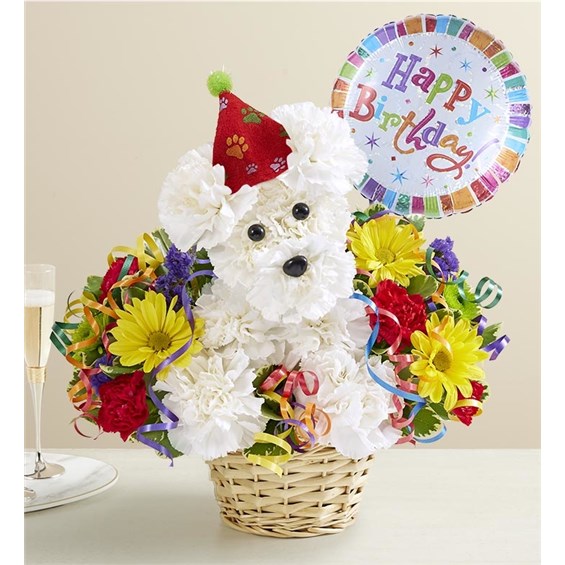 Every birthday party needs a party animal…especially one as cute as ours! Our truly original kitty is handcrafted from crisp white carnations and surrounded by a colorful mix of blooms. Arriving in a charming basket and ready to celebrate, this whimsical whiskered pal is the “purr-fect” pick for a fun-filled day.
